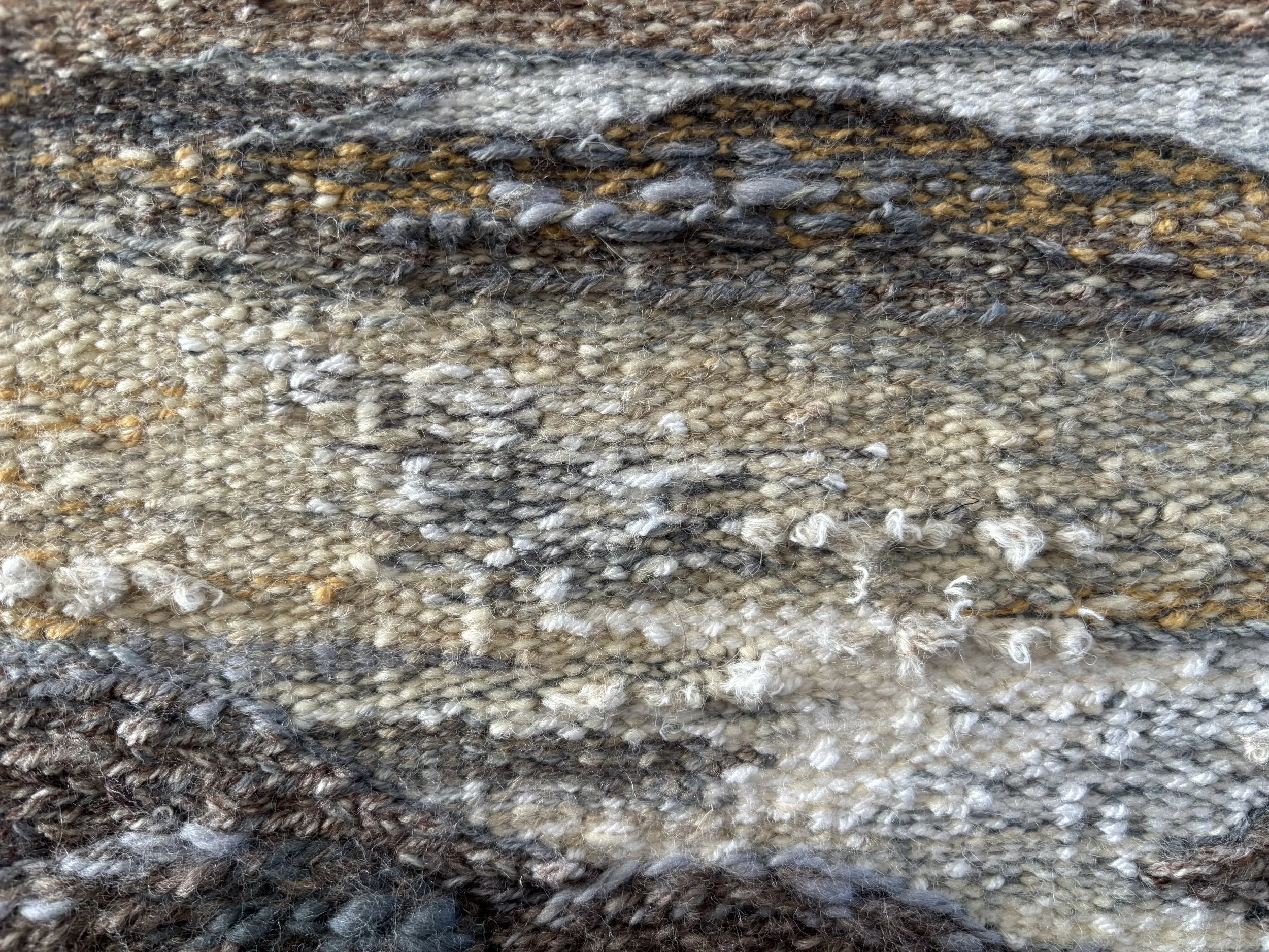 As the weaving progresses, the piece starts to gain weight and presence. I build the surface slowly, layer by layer, adjusting density, colour, and tension as I go. Some areas become heavier and more compact, while others stay lighter and more open, responding to the materials and the landscape I’m thinking about. I often stop, step back, and look at the work from a distance before continuing.